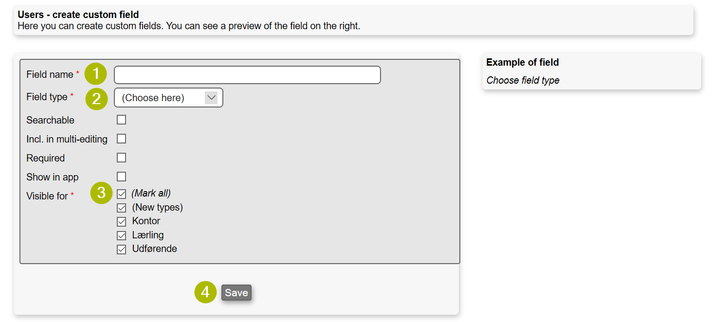 Visibility concerns to the module in question. In the User and CRM module for instance, you will be able to choose which user type or company types the field should be visible for. In the Task module it is the work area that controls visibility, and for equipment it is controlled by the type of equipment. If you mark the "(New types)" option then the field will automatically become visible for any new work area / user type / company type / etc that you create afterwards.