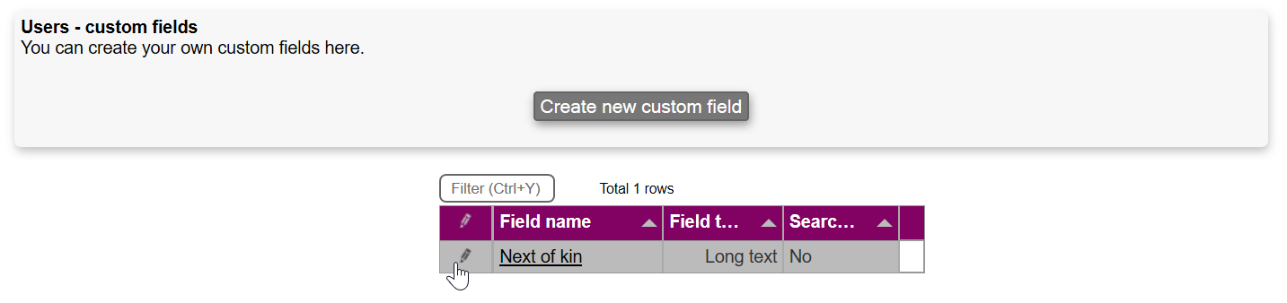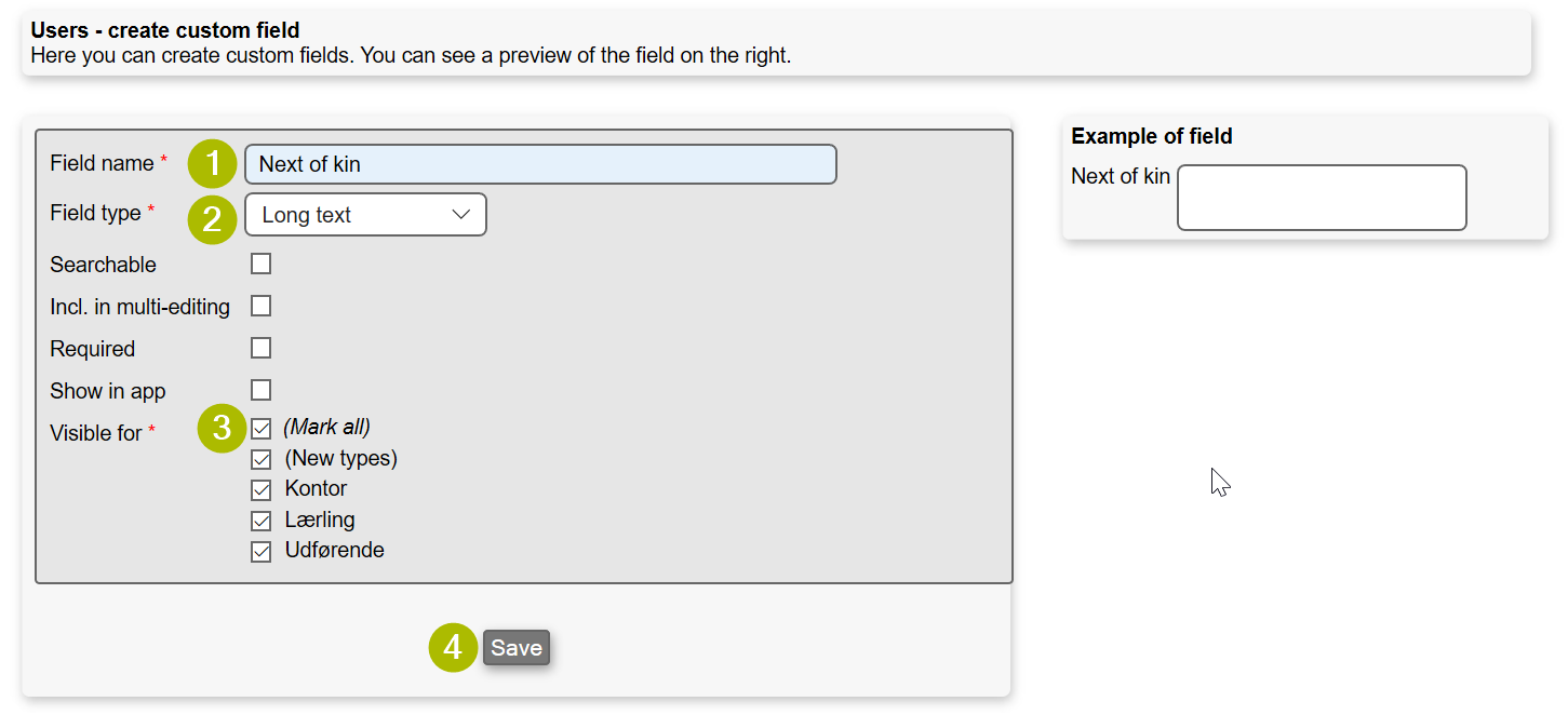 If you for instance wish to add a custom field to users with next of kin information, the following describes how it is done.