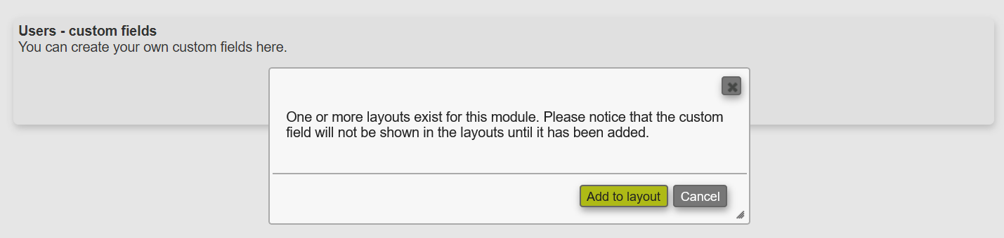 In this Microbizz setup layout has been added in the User module in which we are creating this custom field. Saving the custom field will therefore give following warning:
