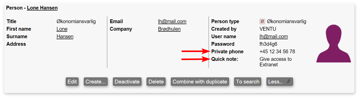 If no layout has been created in the module, the field will automatically be added below the last standard field in the system. The field will only be displayed in the details page if filled out. If the field isn't filled out, you will only be able to see it when editing the information and not when creating new content. Here we've added the custom fields: "Private phone" and "Quick note" custom fields in the Person module, the information shows because it's been added during editing.