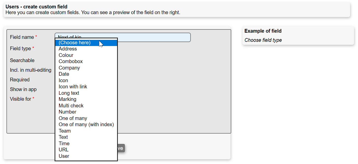 User - makes it possible to assign existing users to the field, adding a search and select function