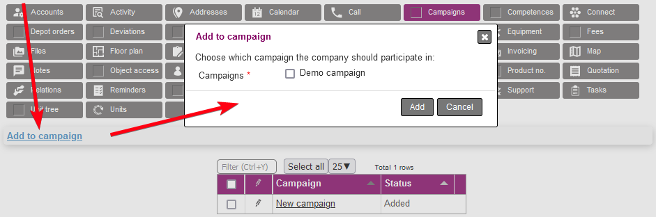 This tab is used to add companies to multiple campaigns from the Sales module: