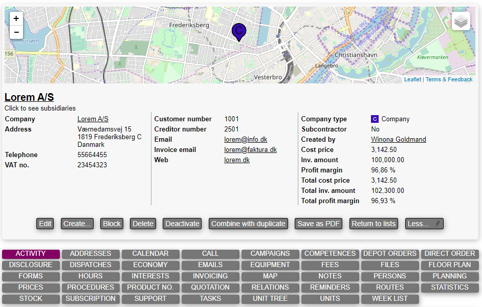 - Activity: Here is shown a chronological list of activities that the company has been involved in.