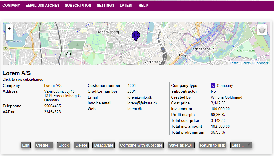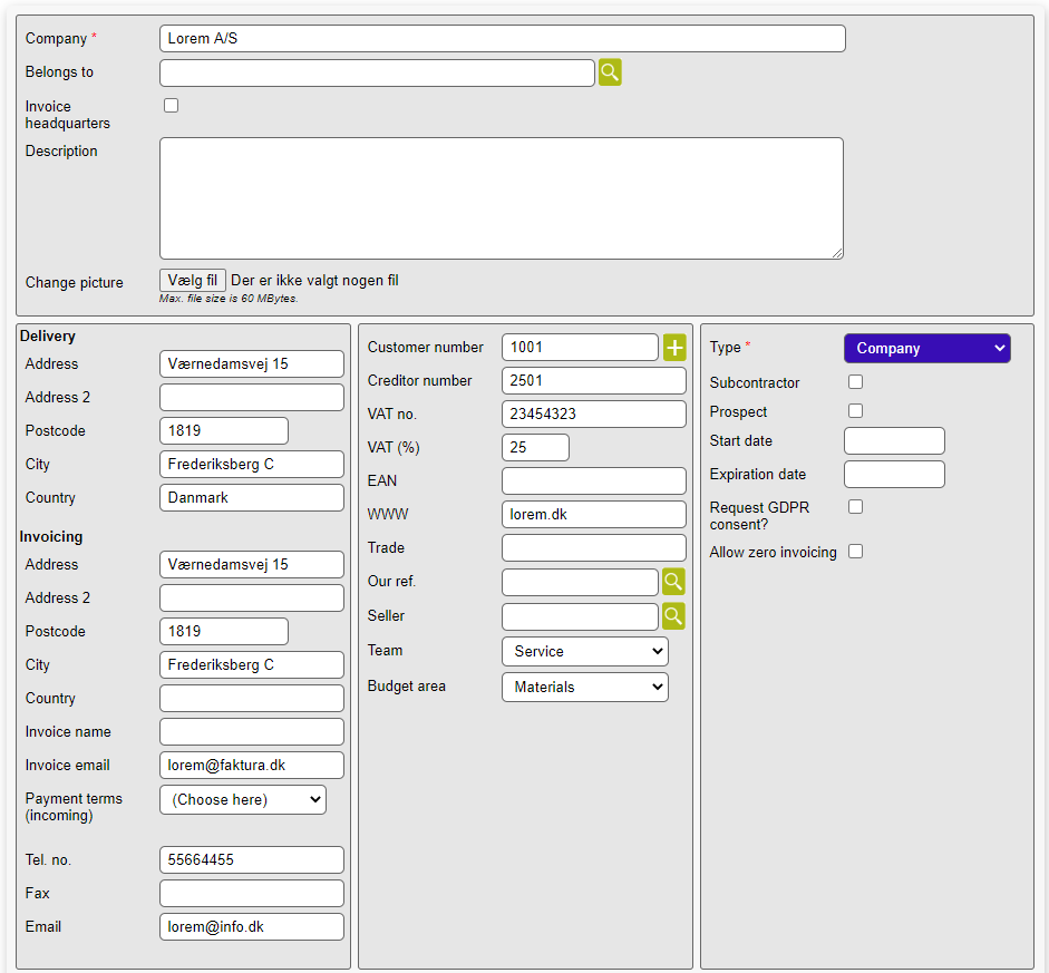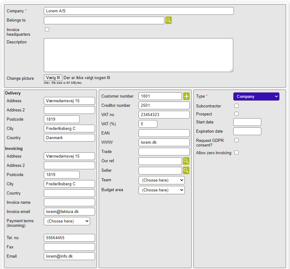This function will save you some time when creating a new company in Microbizz. It is possible to load information about the company e.g. addresses etc. from an external CVR database.