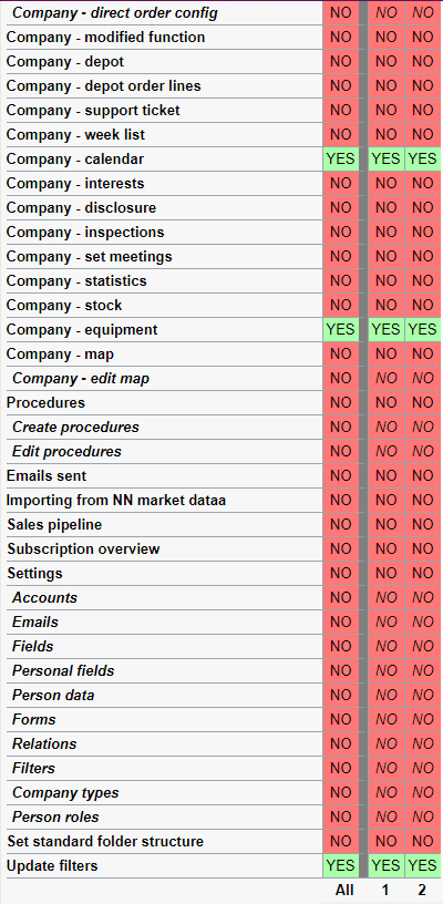 - Company - NN market data: Allows you to specify who has access to the menu NN Market data (special add-on for Danish solutions)