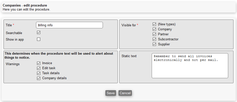 Static text: When using this option, there will be a text shown on all companies that is allowed to show this procedure. This is used to show the same information for many companies without having the need to add it individually