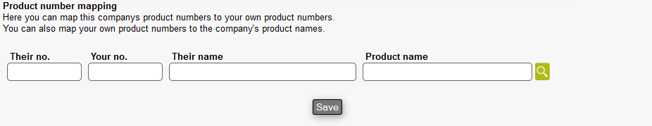 This tab will let you map this company's product numbers to your own product numbers. You can also map your own product numbers to the company's product names.