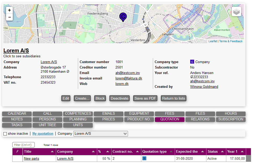 This tab let's you see past and current quotations related to this company, while also being able to create new ones.
