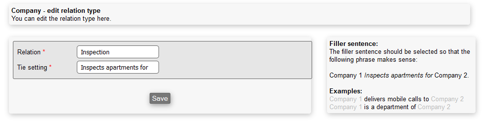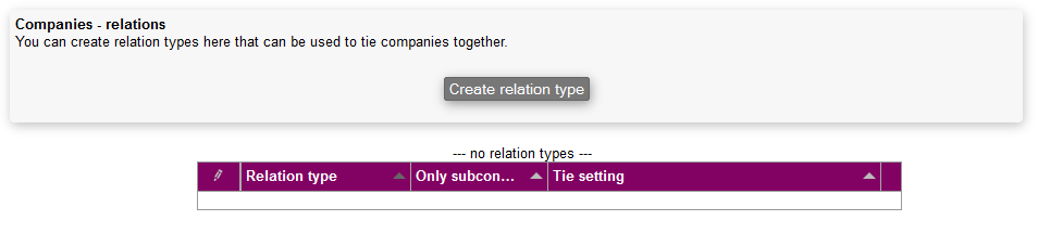 In this menu, you can setup the relation types that will afterwards be used for relating companies to each other and to help with the subcontractor functionality.