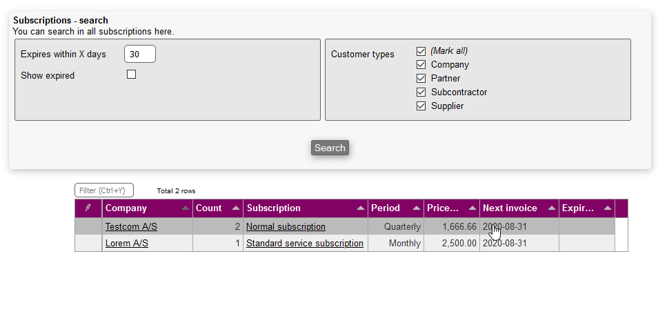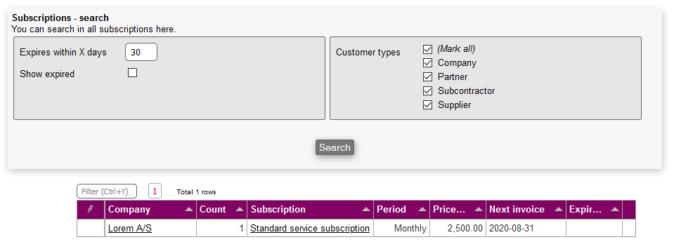 Show expired: Includes/excludes expired subscriptions in the search