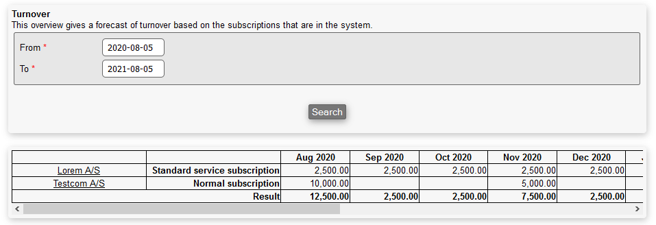 These are shown divided in the months they are due, giving an estimation about the revenue for all subscriptions in the system.