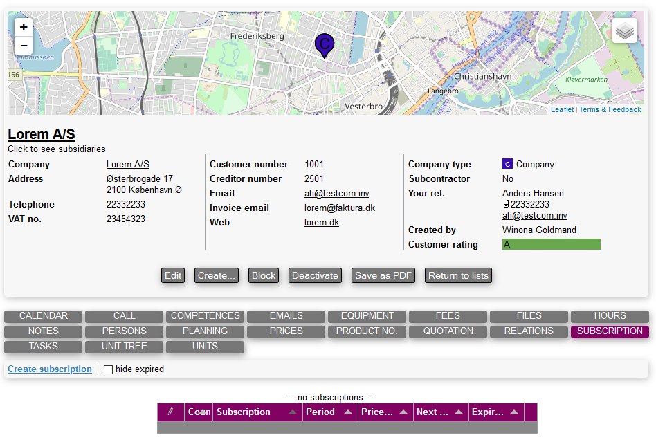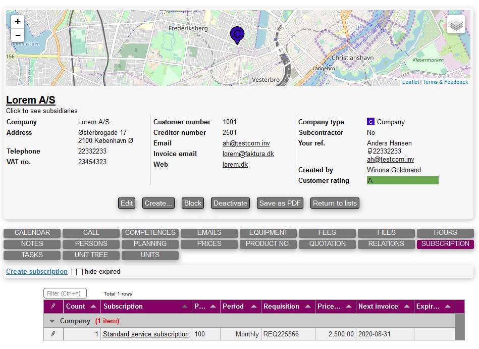 Creating a new subscription is done by accessing the subscription tab directly on a company main card.