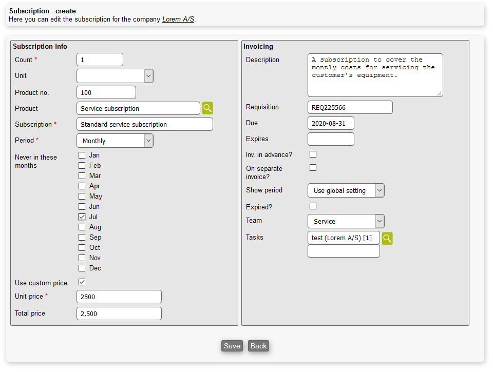As seen above the creation of a subscription is divided in two sections. Info and invoicing.