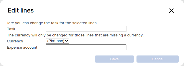 The Lines box shows the lines for the EDI. You may mark one or more of the lines and edit these to set the task or set the currency (for those lines that are missing a currency), or set the expense account.