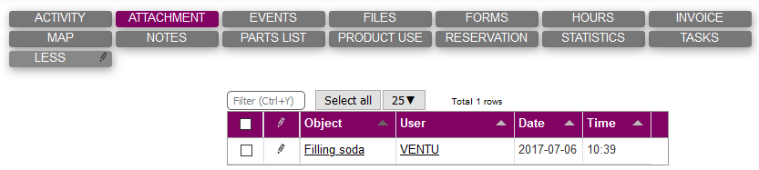 If there are any objects when accessing the attachment tab, we can either detach the object from the equipment, or we go to the object in question by clicking on the object's title: