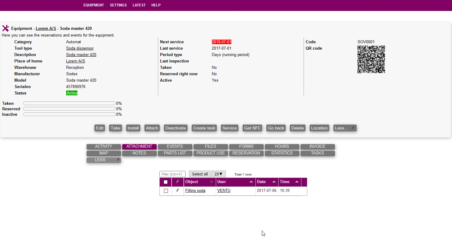 The attachment tab shows a list of objects the equipment is attached to.