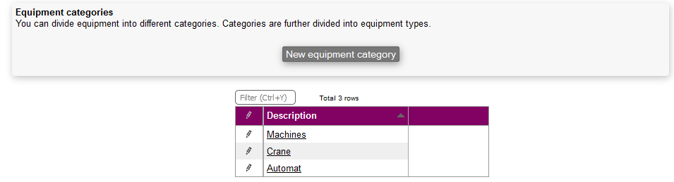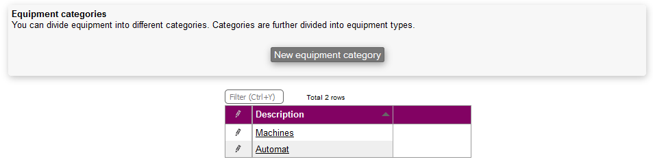 Equipment categories are fairly simple and are managed in the Equipment modules settings menu. When accessing the menu you'll see a list of existing categories. To edit these simply click on the pencil.