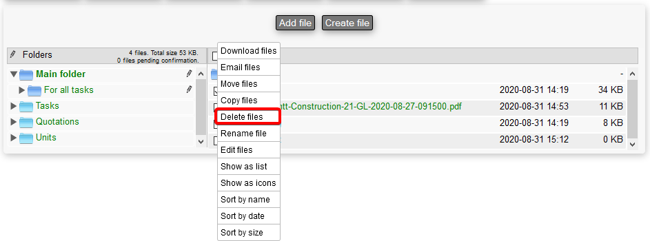 Deleting is also done with the same pencil menu on the right side, and then selecting delete files.