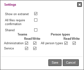 - Read/write: Choose if internal teams members and or persons (on the extranet) can read and write the folder and it's content