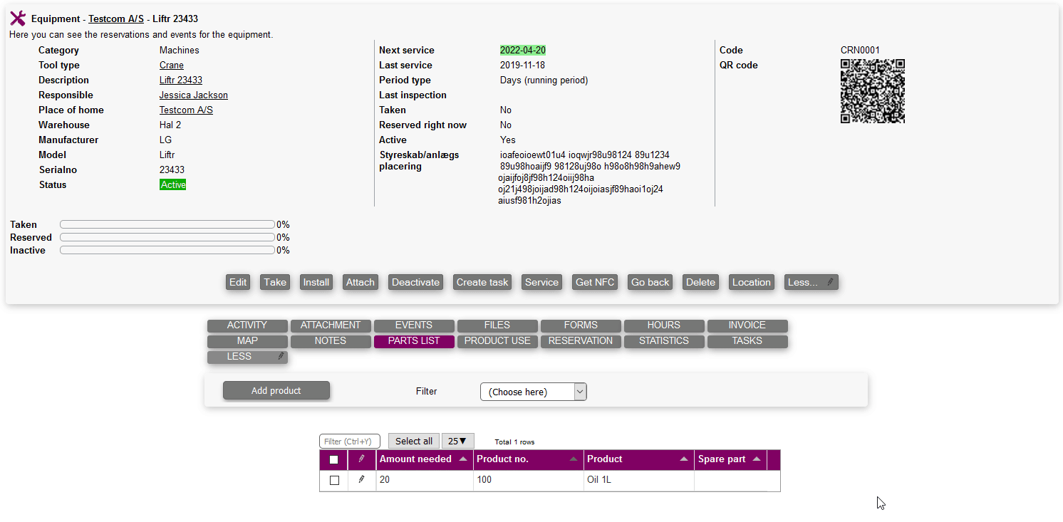 The parts list tab allows you to add products to the equipment as parts.