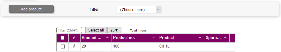 By clicking the Add product button, you can choose any product from your list of products to be a included in the parts list.