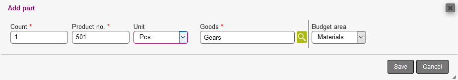 Add product: Add a product to the parts list