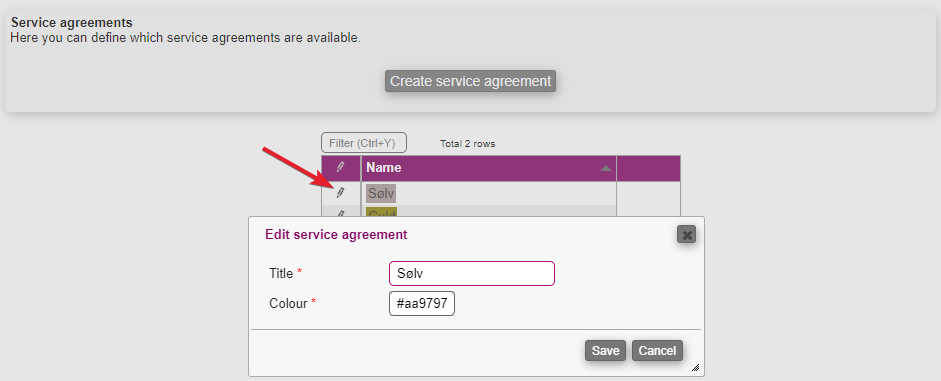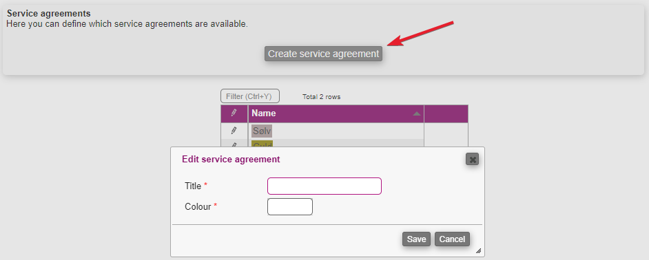 If you want to create a new agreement simply click the Create service agreement-button. Next, you'll have to name the agreement and give it a colour.