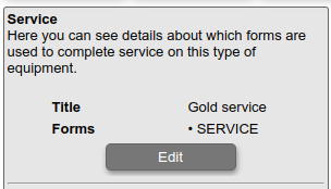 Service (or inspection) is performed by clicking on the Service button on the details page for an equipment. This will bring up a list of service protocols to choose from; these are the protocols defined for the equipment type. When you choose a service protocol you will then be asked to fill in the forms that make up the protocol; this may be 1 form or it may be several forms. You may fill in only some of the forms and then save for later.