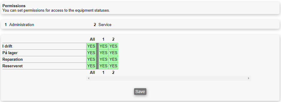 The available permissions for the equipment status depend on the ones you have created, and are therefore custom for each Microbizz solution (i.e. your solution most likely differs from another company's Microbizz solution). For more on how to create equipment statusses, please refer tothis section.