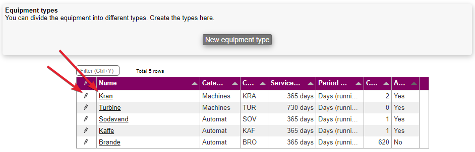 Equipment types hold more information about the equipment than the category. The category simply categorizes the equipment types, while the type is the specific piece of equipment you work with. This could be anything from a crane model, a vehicle model, a hammer, etc. In order to know how to divide into types, depends on the work you need to perform with the equipment e.g. service and just internal management, and if it is service, which interval it has.
