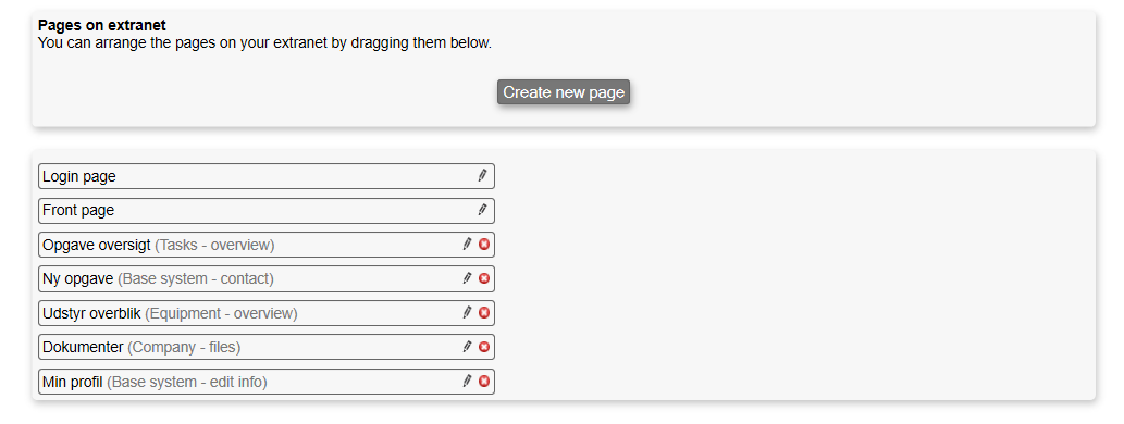 When you choose in the menu in the module Extranet, you will get a list of all the current pages.
