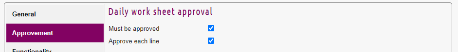 To enable approval, check the box "Must be approved". Pr. default the hour sheet is approved as a whole, but one can enable approval of individual lines by checking the "Approve each line" item. In this case each line on the hour sheet must be approved individually and when all of them are approved, then the hour sheet as a whole is considered approved.