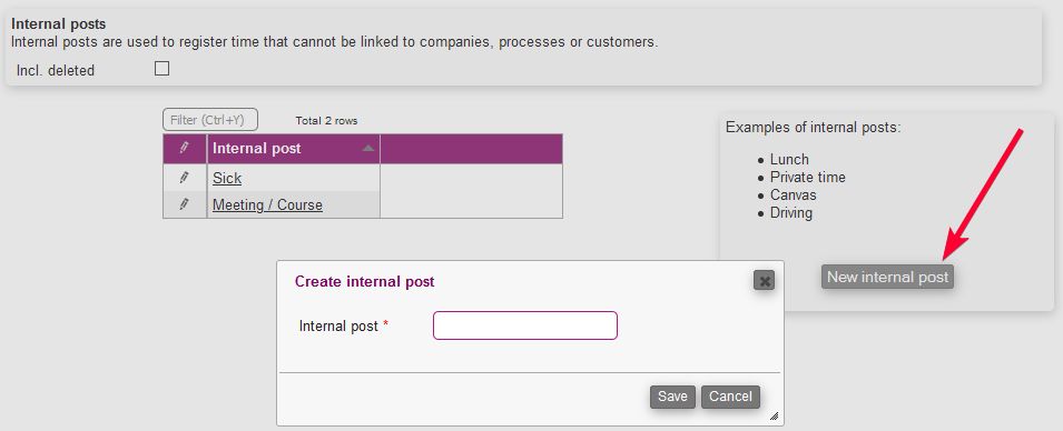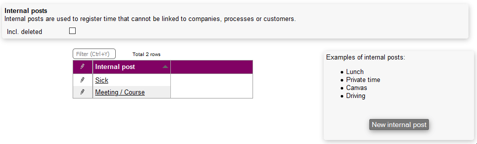 Internal posts will be accesible on the daily worksheet just like other registrations. Examples on a continously reoccuring post could be: