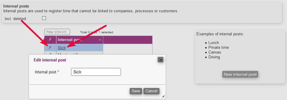 The internal post can also be deleted by clicking the pencil. Note that if you edit an internal post that has already been used, or delete it entirely, then you also delete all the registrations made on this post, and thus no longer possible to draw statistics from the post.