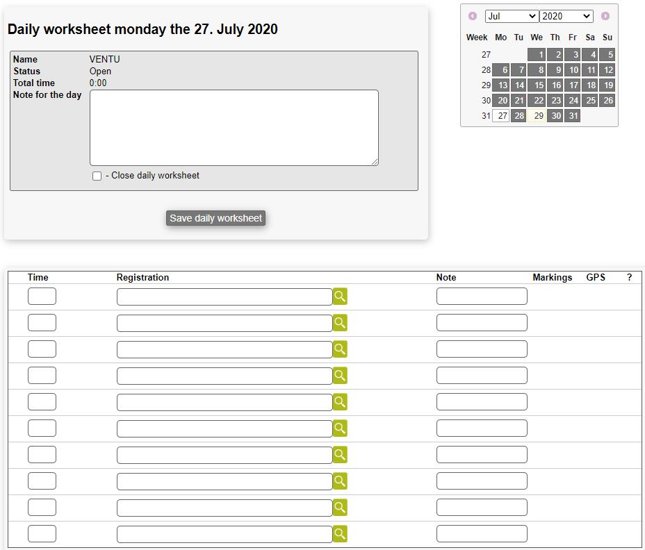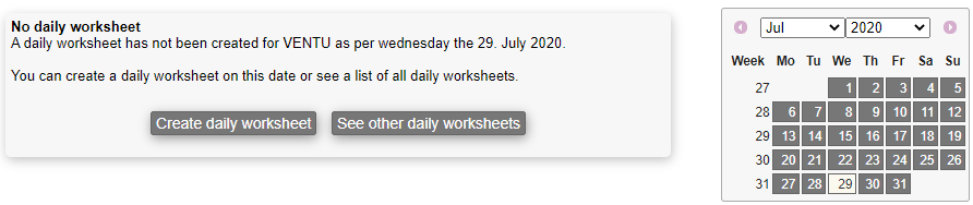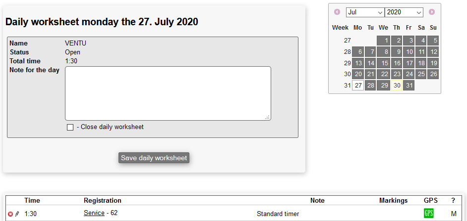 To finish the worksheet for the day, one can write a note for the day before pressing the "Save daily worksheet"-button. Furthermore, if "Close daily worksheet" was ticked off before pressing the button, it is not possible to register any further.