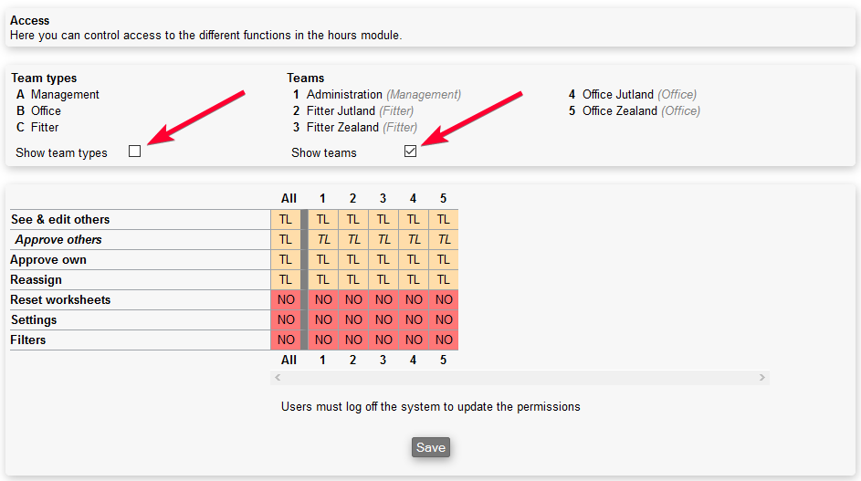 In this module, you can set the permissions for team types and teams by ticking their respective boxes.