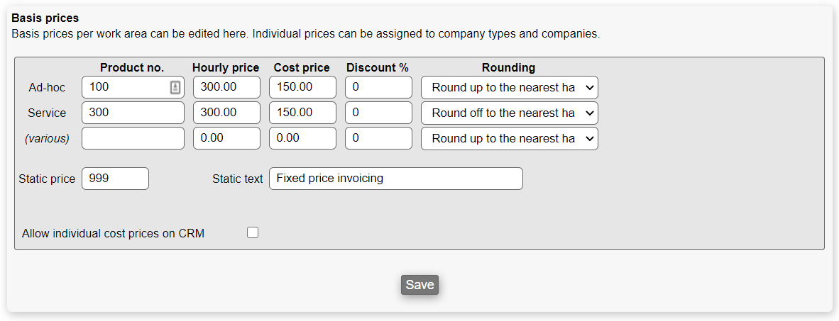 Product number: The product number that the time registration should use when being invoiced. It's important to know that there is no connection to the product list - any product number can be used here. Even ones that don't exist in the product list