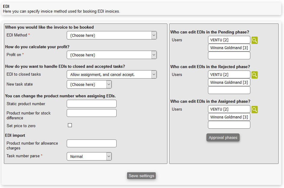 Who can edit EDIs in the Assigned phase?: Choose as many users as you want, that are allowed to edit EDIs in the "Assigned"-phase. For more on phases, read next section