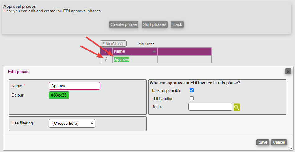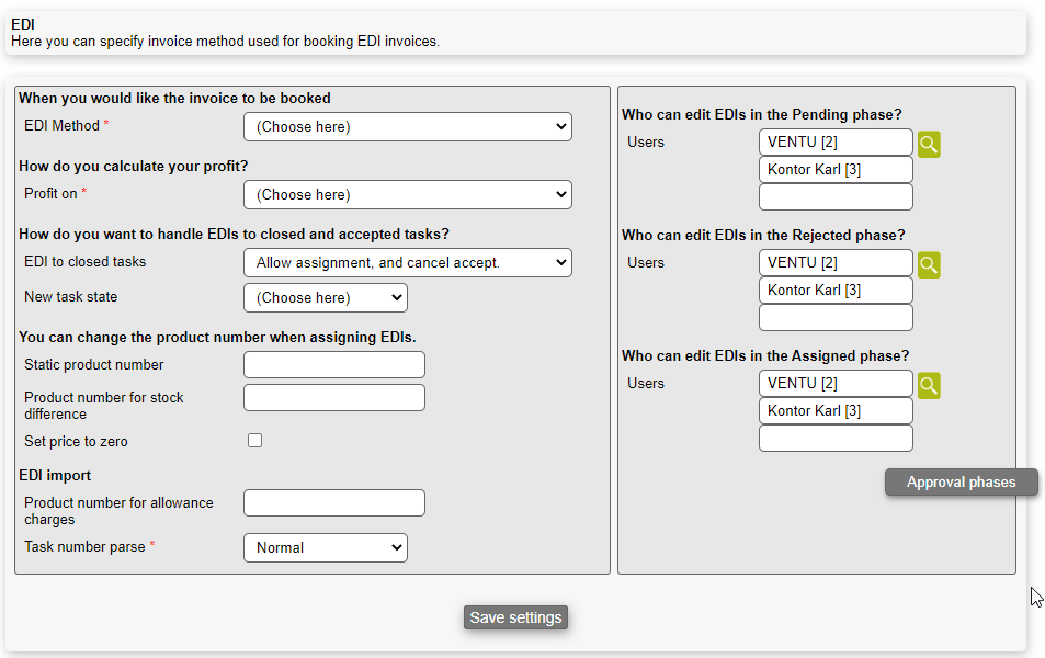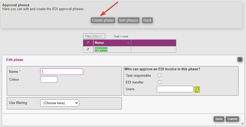 By clicking on the Approval phases button, you are navigated to where you can create and edit any EDI approval phase you need.