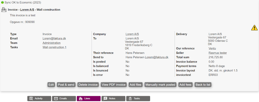 Add fees: To include fees in the invoice before posting and sending, these will be shown under the tab “Lines”.