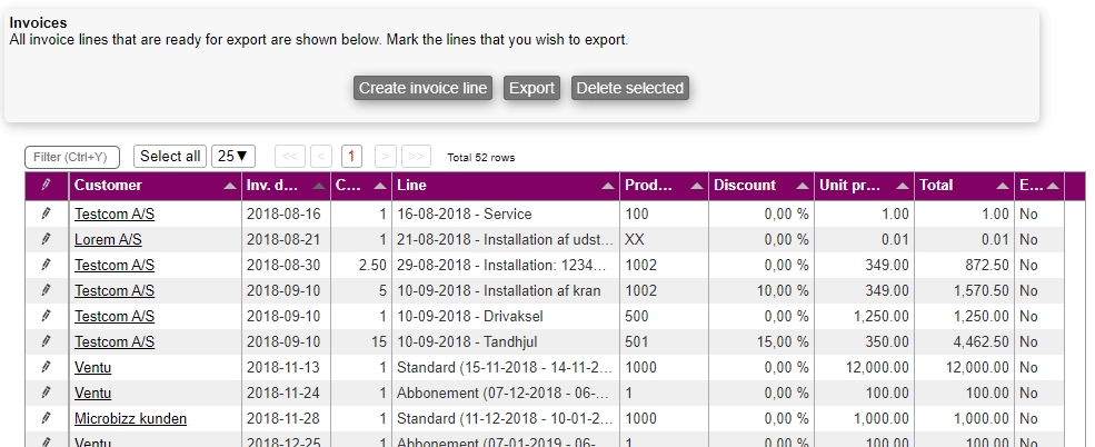 This way of handling invoice lines is used when Microbizz isn't configured to use an integration and when the Invoice in MB setting is disabled; instead Microbizz can only export invoice lines in various ways: as a CSV file, to Economic, to Fortnox etc.
