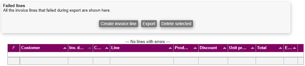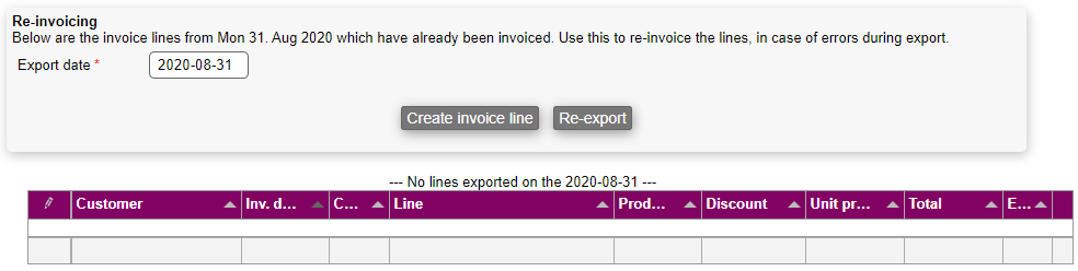 As in the previous section, you can Create invoice line. For more information on this, please refer to it in the beginning of this page. The Re-export button does the same as the Export button i.e. exporting any invoice line you may have selected.