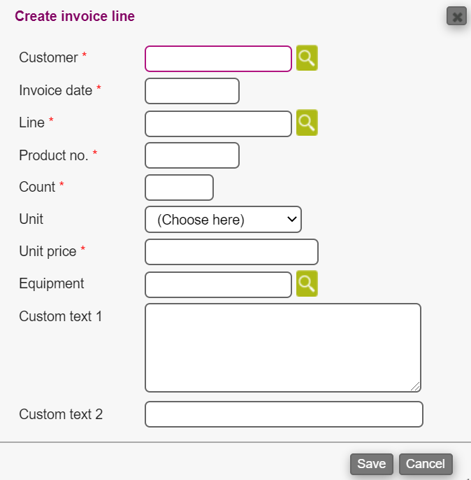 By clicking the Create invoice line button, you will be presented with the following screen:
