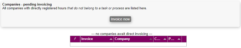 You can choose to invoice these companies, thus creating invoice lines for the hours. To do so, you need to mark the invoice lines - if any - and then press the Invoice now button