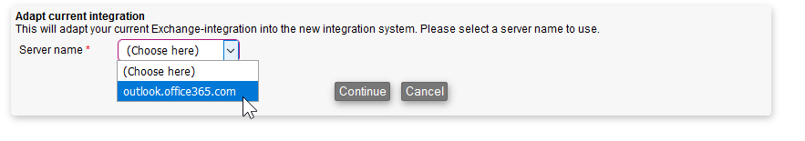 - Choose which Exchange integration you want to adapt and click Continue