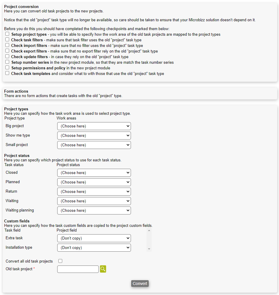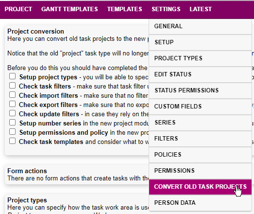 - Convert all old task projects: This will convert all task types-projects to the new project object