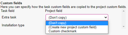 - Choose an existing custom field: As seen in the example, the option "custom checkmark" is available. This is an already existing custom field from the project module, that is of the same type as the task custom field "Extra task" and therefore they can be matched