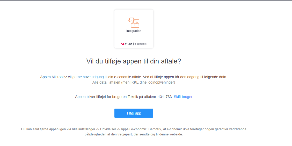 Såfremt du bliver videresendt til E-conomic, skal du blot følge instrukser herfra. Det kan se ud som følger: