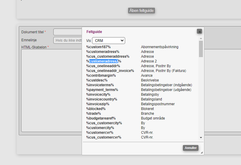 Man kan evt også kigge i Feltguide i HTML dokument opbyggelse, her kan man se man af de felter som er tilgængelige, f.eks. this.customer.customeradress2 :