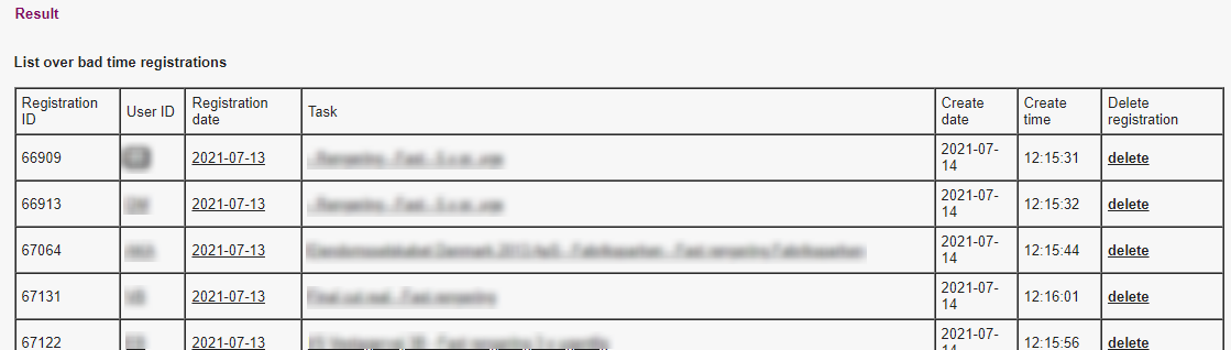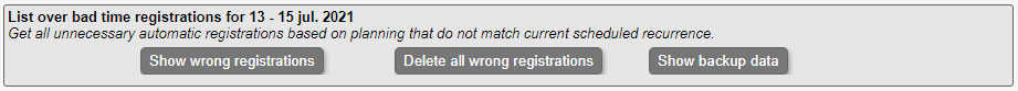 1) Tryk på "Show wrong registrations" for at finde alle de tidsregistreringer som er forkerte i perioden. Man kan vælge at slette enkelte registreringer ved at trykke på "delete" i sidste kolonne.
